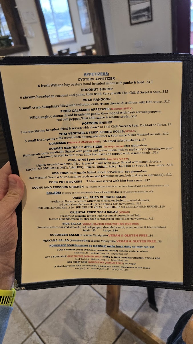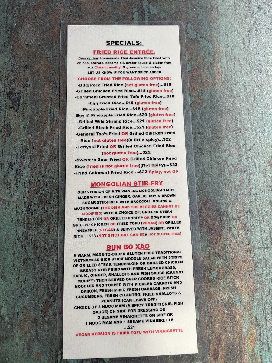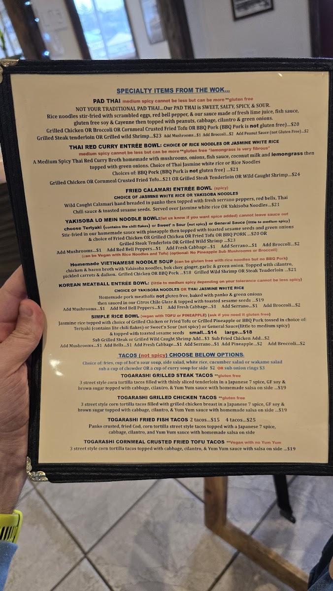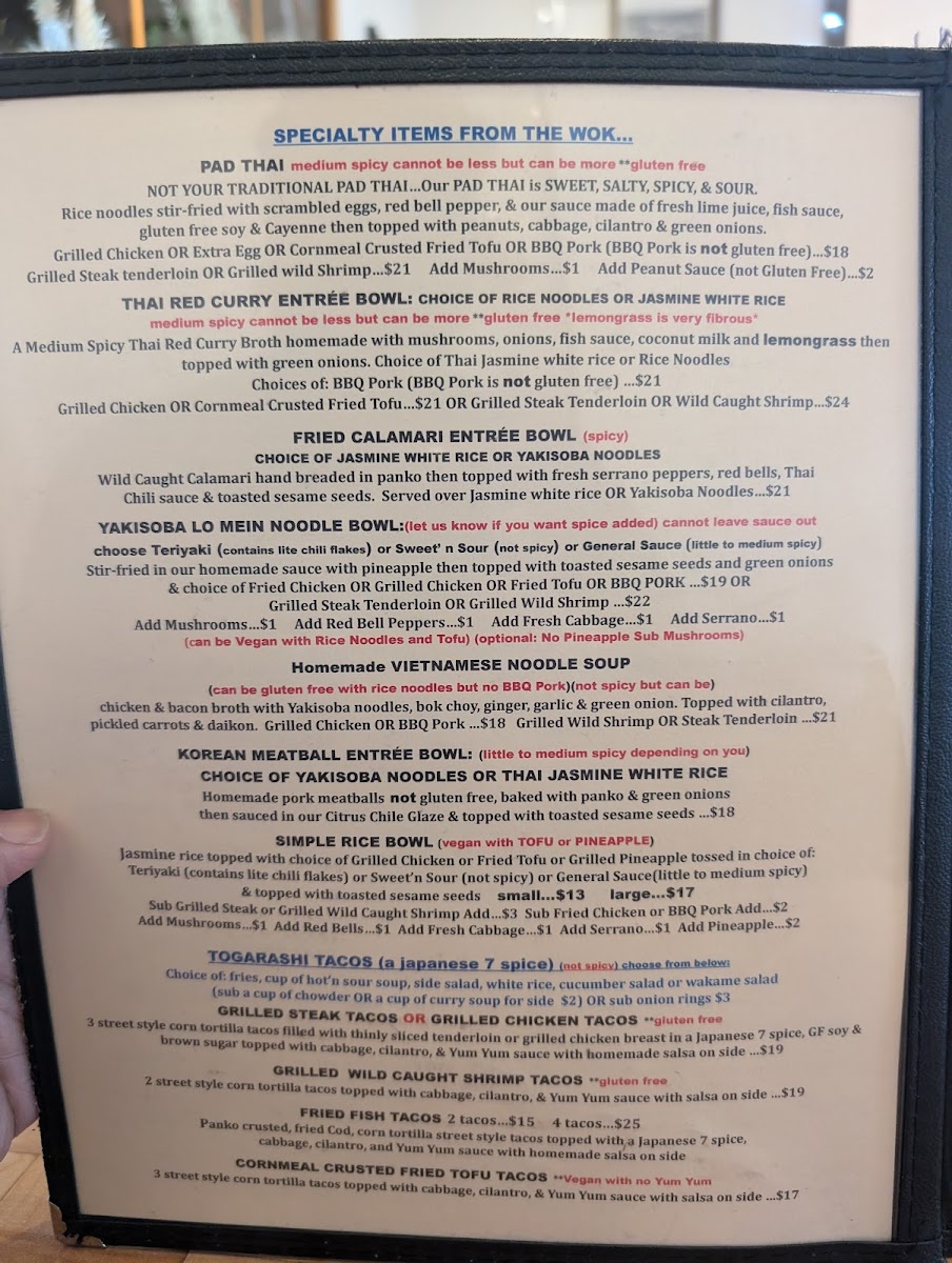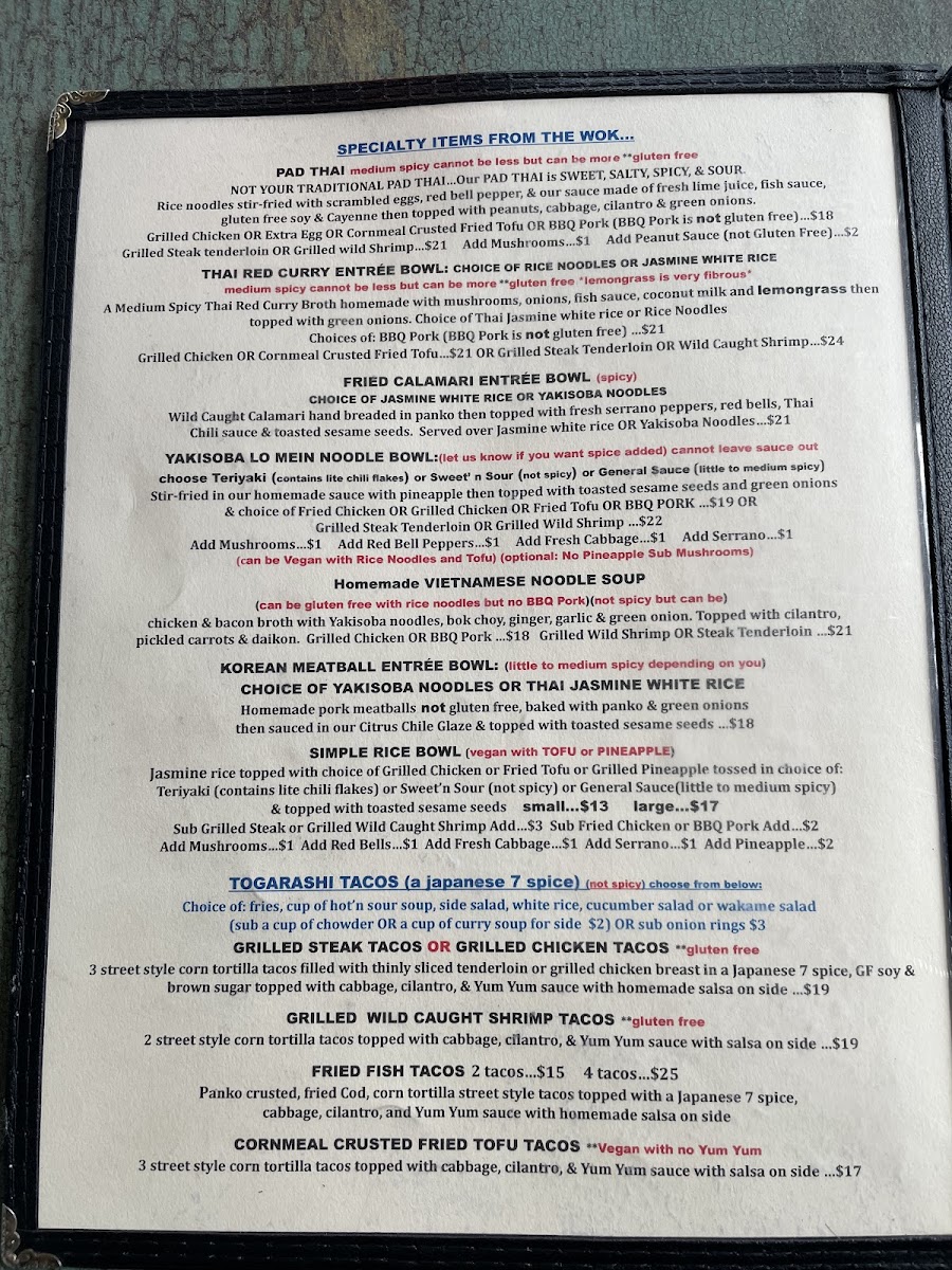The menu features a range of dishes suited for different moments—from hearty fish and chips or a classic club sandwich to more adventurous options like red curry with wild prawns or togarashi steak tacos. Soups like clam chowder or homemade Vietnamese noodle soup provide warmth on cooler days, while the fresh, bright flavors of dishes like pad thai or the Vietnamese steak noodle salad bring a lively touch to the table.